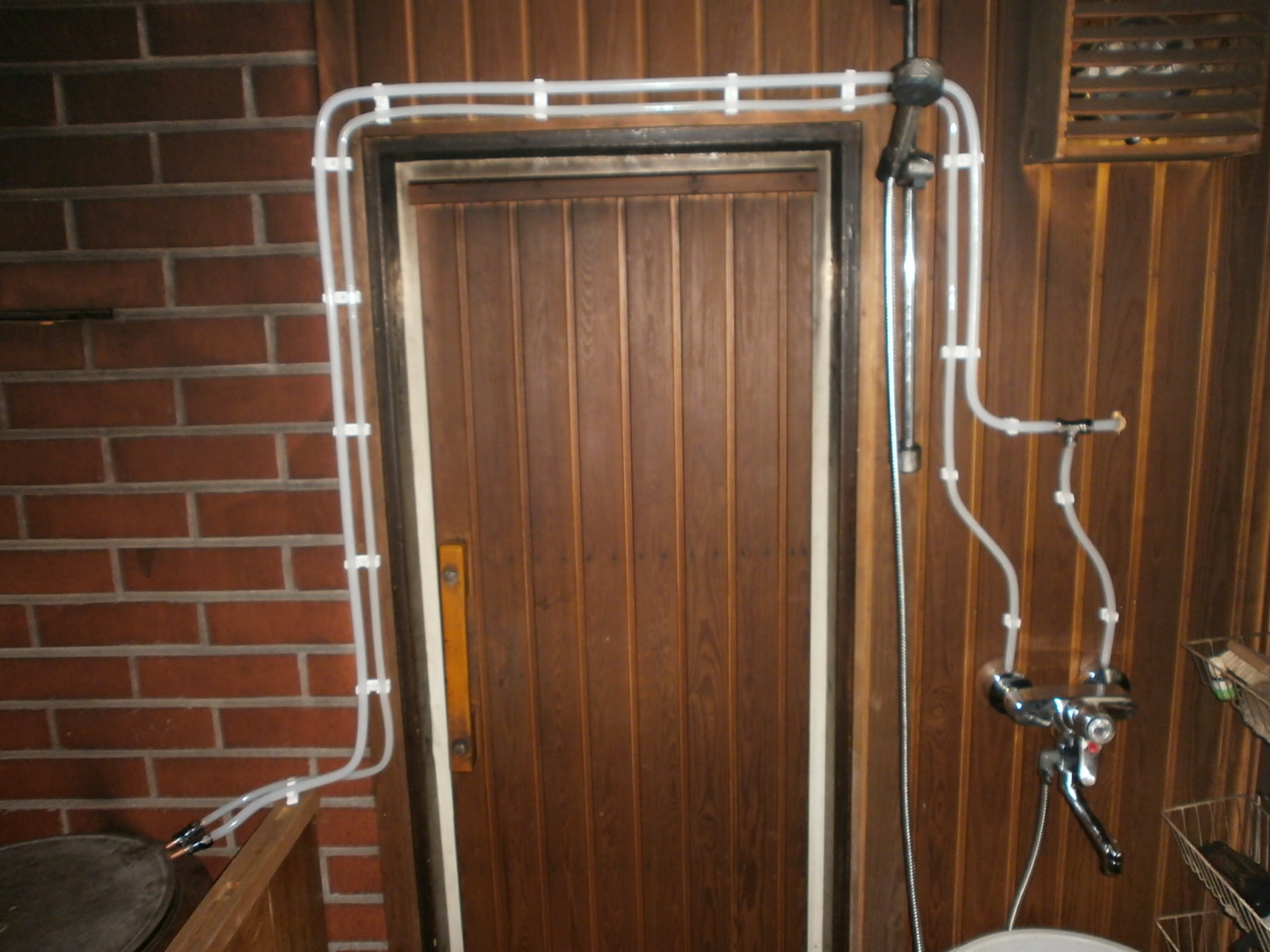 Saunaan laitoin suihkun, myös suihku oli asiakkaiden toiveissa. Saunassa oli ja on pata josta lämmin vesi otettiin pesuvatiin. Asensin pataan kuparikierukan jossa suihkuvesi lämpiää, pata on nyt myös puulämmitteinen lämminvesivaraaja suihkulle.